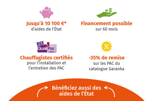 *Montant maximum d’aides financières accordées par l’Etat pour le remplacement d’une chaudière gaz ou une chaudière fioul par une pompe à chaleur air-eau. Ces aides sont attribuées par l’Etat sous condition, notamment, de ressources, et calculées en fonction de barèmes. Pour plus d’information sur ces aides, vous pouvez consulter : Rénovation énergétique : les aides auxquelles vous pouvez prétendre | economie.gouv.fr.